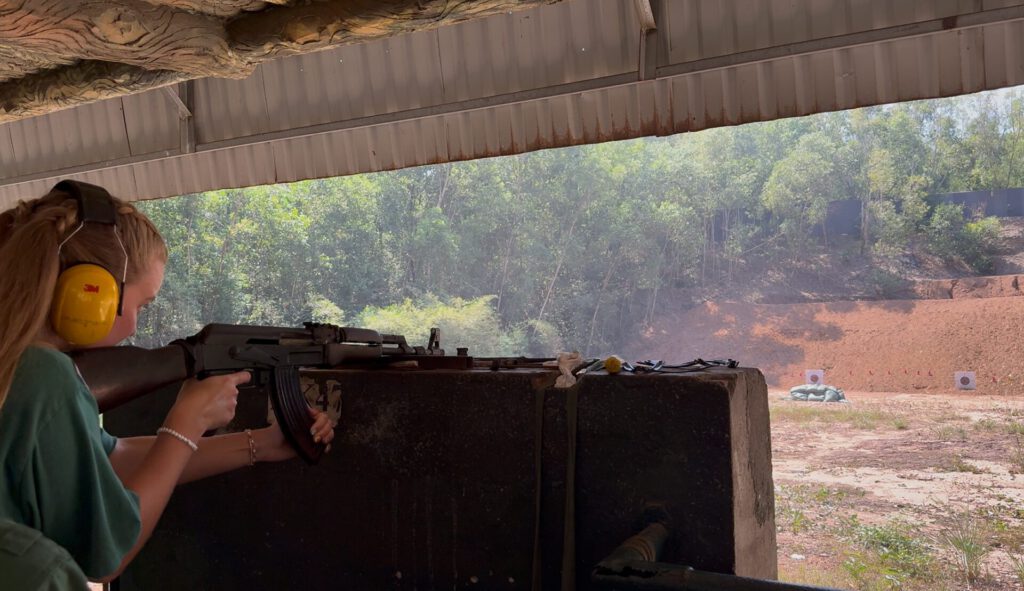 Je kunt hier zelf een stukje door de tunnels kruipen (kies vooral de korte versie als je claustrofobisch bent ) en krijgt onderweg van je gids veel interessante info mee. Onze gids sprak goed Engels en wist alles over deze heftige periode in de Vietnamese geschiedenis. Voor de waaghalzen: je mag hier zelfs schieten met een AK47.